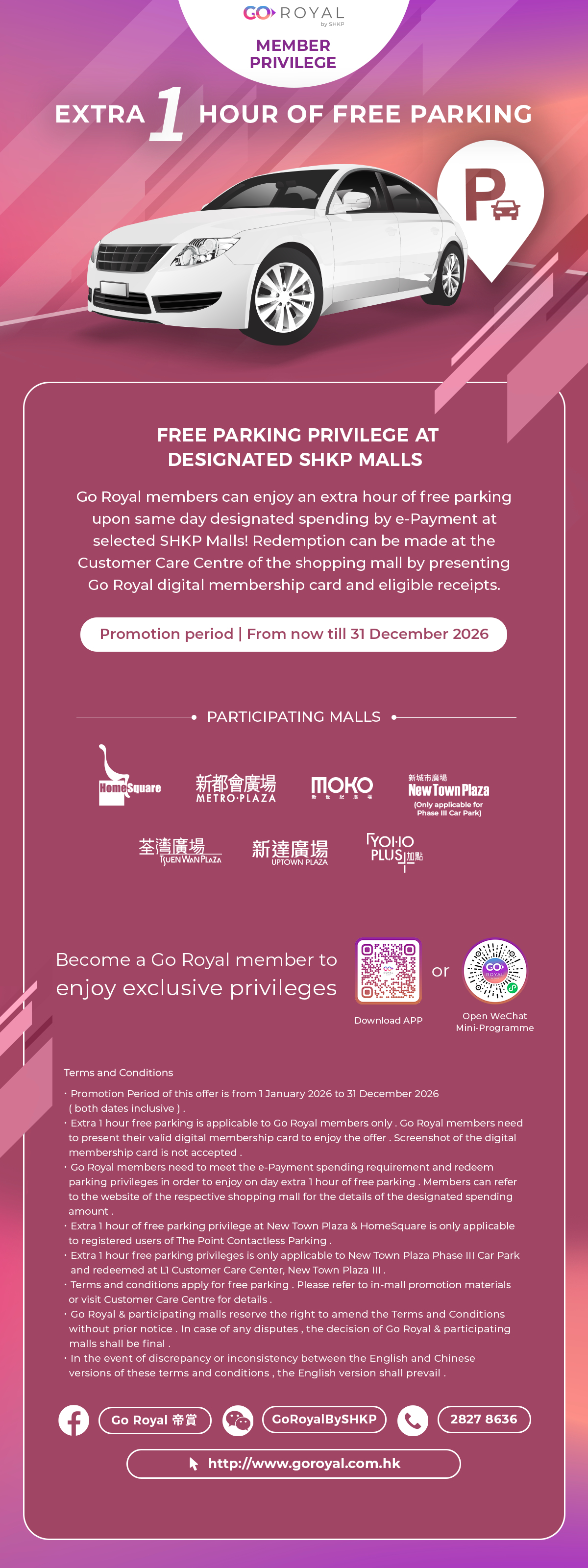 Details of Extra 1 Hour of free parking in participating malls: