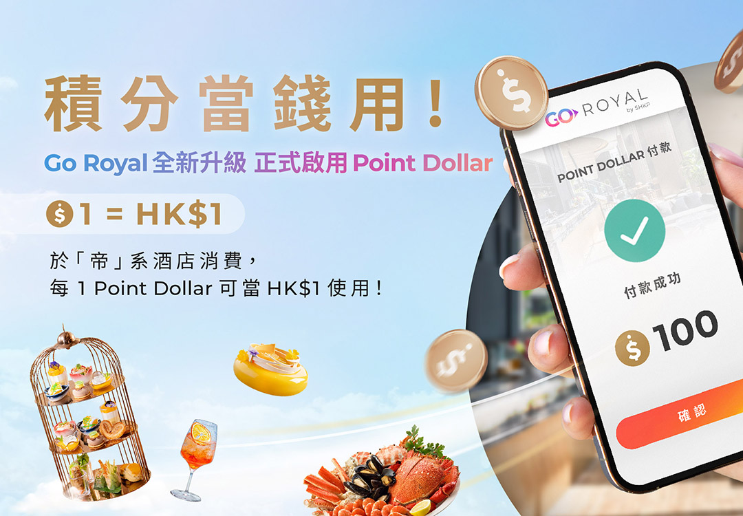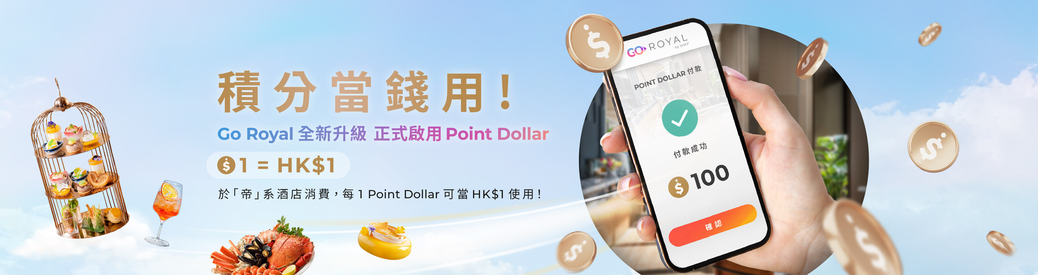 Point Dollar 是一種付款方式。Go Royal 會員可通過 Go Royal APP 或微信小程序,將賬戶內的積分兌換為 Point Dollar,並於參與酒店及餐廳作即時現金消費。