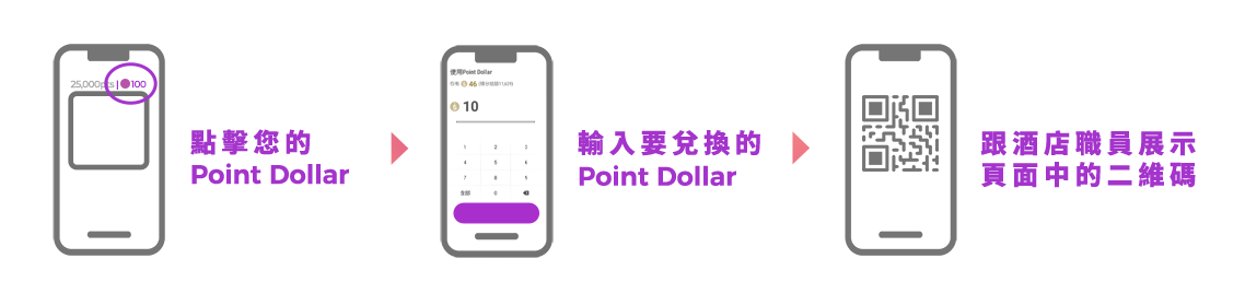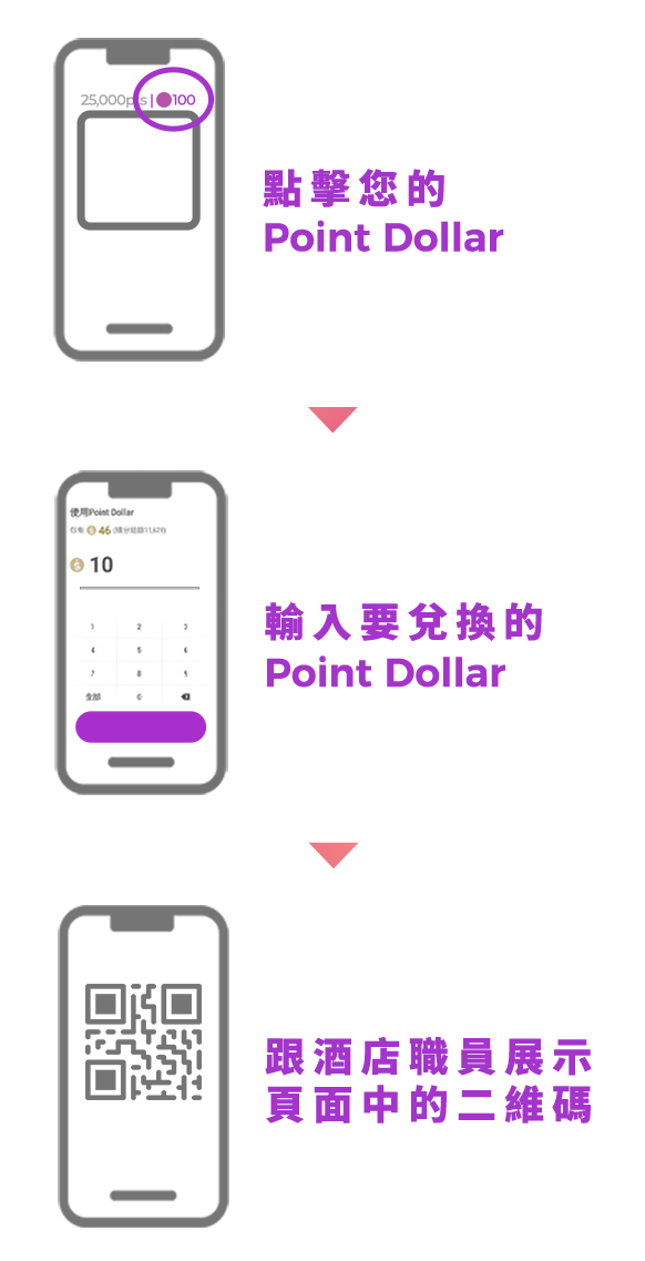 以積分兌換 Point Dollar 並於酒店及餐廳消費時積分當錢用!