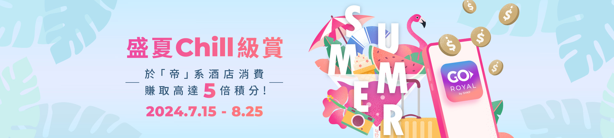 由2024年7月15日至2024年8月25日,Go Royal會員只需於Go Royal APP或官方網站之活動頁面完成登記,並於「帝」系酒店憑指定合資格消費*成功賺取積分至指定門檻,即可獲享高達5倍積分。額外積分詳情如下: